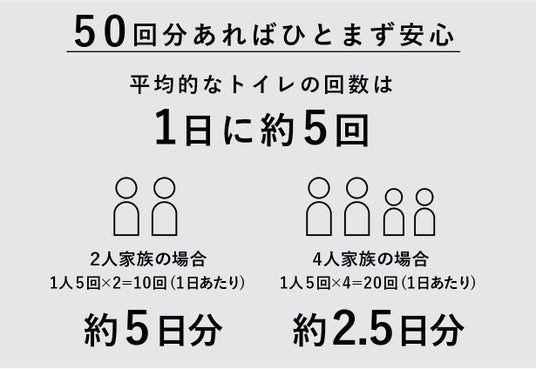 在宅避難をする上で必要な備えは最低でも3日分(可能であれば1週間分)です。人の平均トイレ回数は1日に約5回であるため「ヨカレカシ」非常用トイレ(50回分)が1箱あれば、ひとまず安心です。