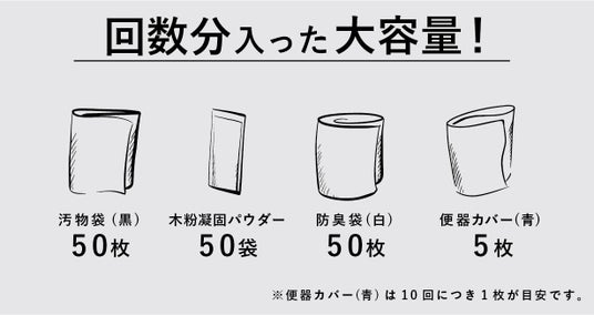 こうして、青色の便器カバーは1枚では足りないことを実体験から痛感していたため、余裕を持ってご使用していただけるよう、5枚(トイレ10回につき1枚)をご準備しました。また、防臭袋はトイレを済ませる度に使えるよう、回数分をご準備しました。