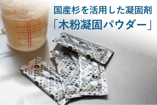 そこで出会ったのが国産杉を活用した、杉木粉配合の凝固剤「木粉凝固パウダー」。木粉凝固パウダーは生産地が明確な純国産材を用いた製品です。