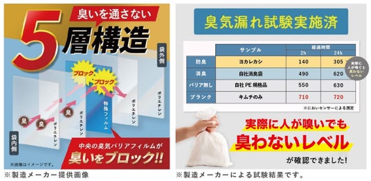 家庭用の袋では使うことがない樹脂(エンジニアリングプラスチック)を使用した特殊フィルムで、これまでの防臭袋とは違う素材から作った高性能な防臭袋です。