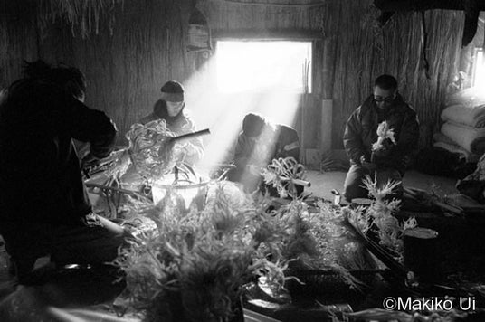 伝統的なチセの中でイナウ(祭具)をつくる男たち。