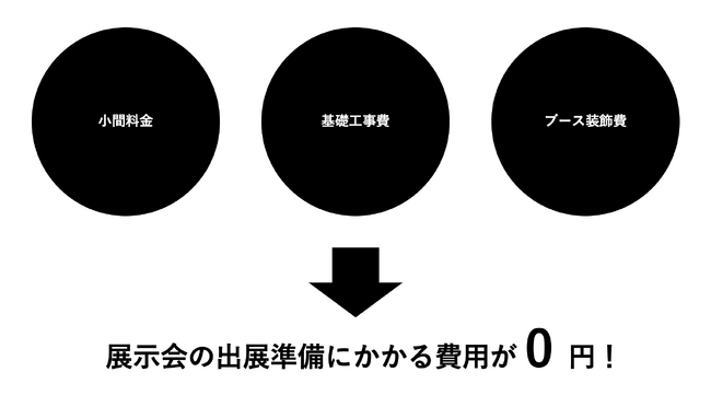 一般的に展示会は、展示会主催会社へ支払う小間料金の他に、ブースの基礎工事や装飾などの費用も発生し、1度の出展で数百万円の予算が必要になります。そのため、出展予算の確保が難しく、展示会出展を見送る企業も多くいると思います。「展示会ゼロ」で初期費用を0円にすることで、展示会の出展ハードルを下げて、各社が展示会にチャレンジしやすい座組を提供します。