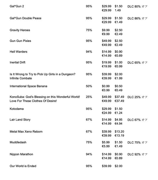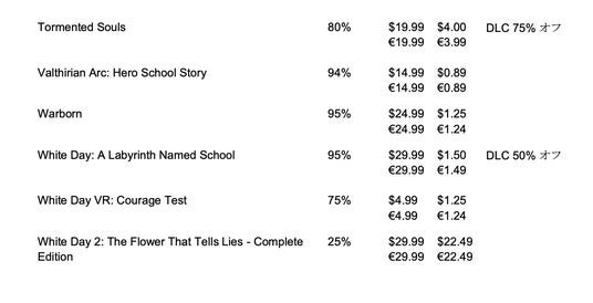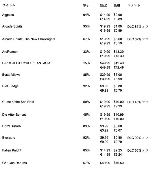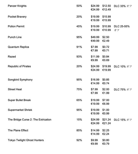 セール対象の全タイトルと、それぞれの割引・価格の一覧は以下を参照してください: