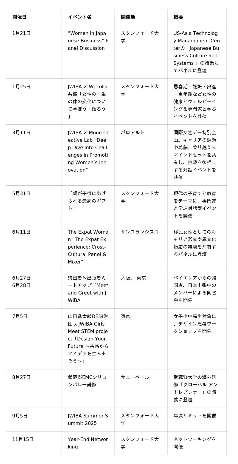 米国シリコンバレーを拠点とする非営利団体JWIBAは、2025年も、女性が自分らしく人生やキャリアを発展させるための学びとネットワークの場を創出してきました。本リリースでは、2025年の活動サマリー、コミュニティとしてのつながり創出、日本・米国を横断した研究や次世代育成の取り組み、本年で3回目となるスタンフォード大学での「JWIBA Summer Summit 2025」開催報告、そして次年度の展望をご紹介します。