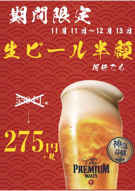 神泡生ビール半額キャンペーンも開催中!12/13(金)まで