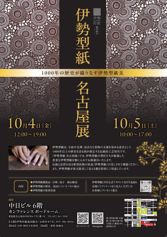 2024年10月4日(金)から5日(土)にかけて、中日ビル6階のカンファレンス ボードルームにて、「伊勢型紙 名古屋展」が開催されます。伊勢型紙は、千年以上の歴史を持ち、着物の文様を染めるための伝統的工芸用具として知られています。本展では、型匠たちが選りすぐりの伊勢型紙を額に入れて展示し、伝統と技術の結晶であるその美しさをご紹介します。