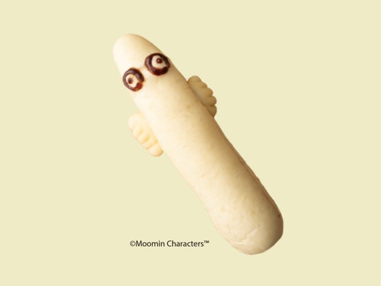 ムーミンのコミックスの1コマ目はいつもムーミンのおしりから。そんなファンの心をくすぐるムーミンのおしりをパンで表現しました。やわらかいソフトで白いメロンパンに練乳カスタードクリームを絞り、ムーミンのカラーを表現しました。