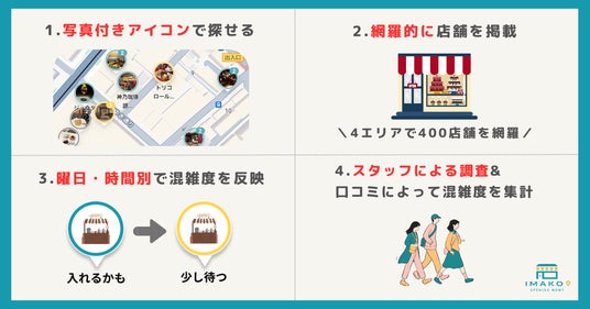imakoは、これらの情報を集約させ、地図上に表示させることで、今いる場所から一番入りやすいカフェ探しをサポートするプラットフォームです。
