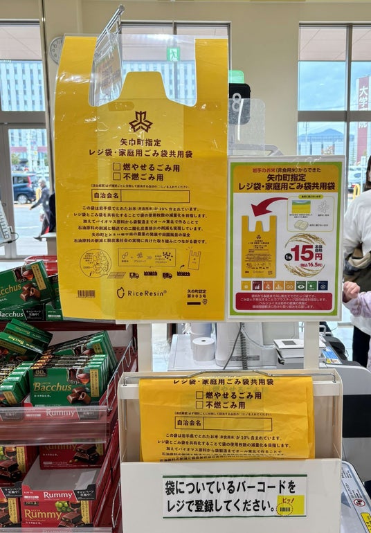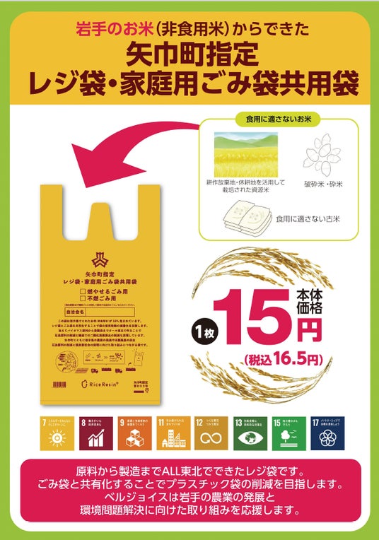 株式会社バイオマスレジン北日本(岩手県紫波郡矢巾町)は、この度、お米由来のプラスチック(以下、ライスレジン(R)︎)を原料として製造された“ごみ袋として使用できるレジ袋(以下、ごみ袋兼レジ袋)”を矢巾町内協力店舗(本記事末尾に掲載)へ導入します。