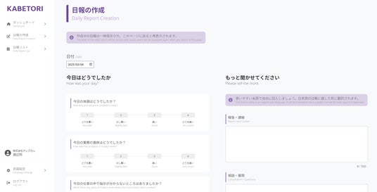 KABETORI は、技能実習制度で義務化されている『技能実習日誌』に着目し、「外国人就労者」と「企業側」のコミュニケーションを円滑化するために開発された日報アプリです。日報という既存のフレームを活用しながら、日々の業務・モチベーション・人間関係などの課題を早期に発見し、データ分析によって改善へとつなげることを目指しています。