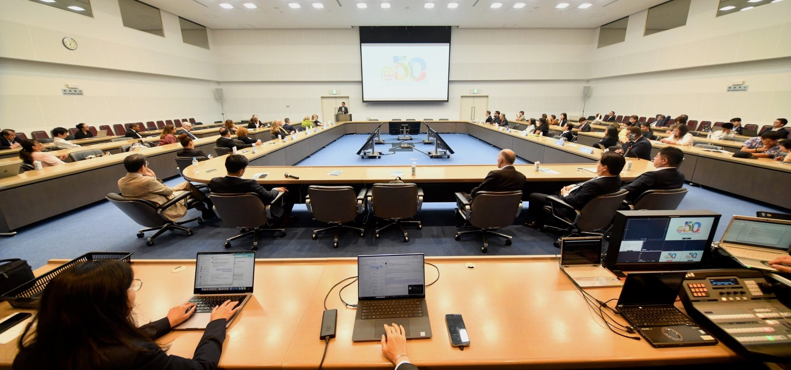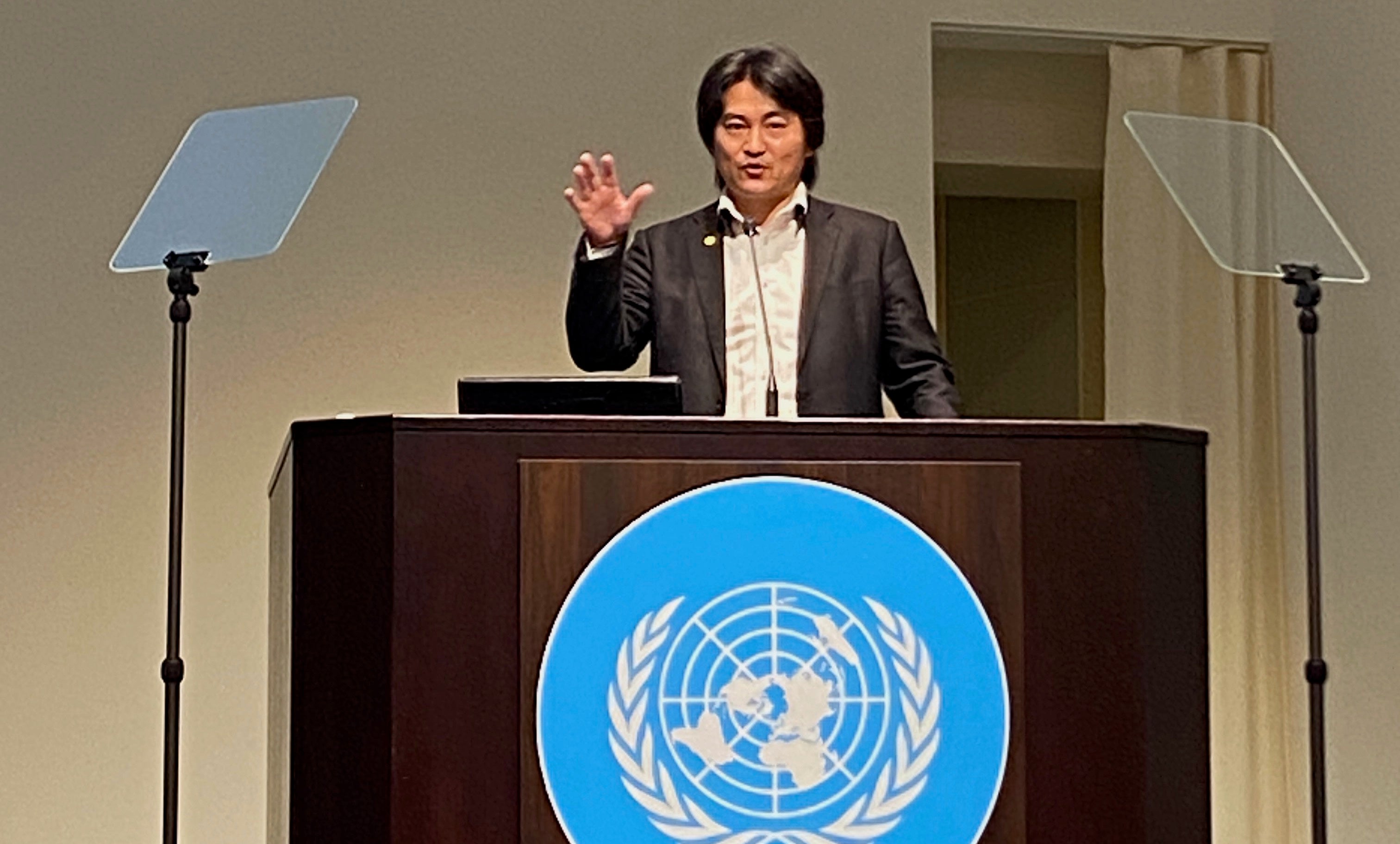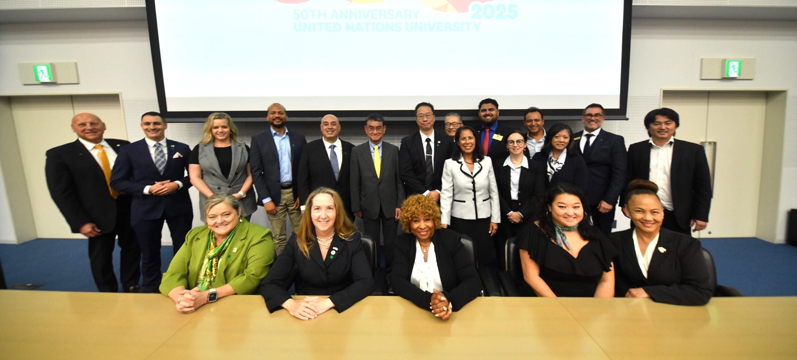 9日と10日、舞台は東京・国連大学(UNU)へ。9日の前夜祭レセプションは、国連大学のホール内で華やかに開催された。会場には日米の自治体関係者や国際機関の代表者らが集い、温かな雰囲気の中で開幕を迎えた。冒頭では、主催者を代表して日米姉妹都市協会(JUSSCA)の小山田真会長が挨拶に立ち、サミットの意義と、日米の地方が担う新たな外交の形について力強く語った。続いて、元駐米日本大使でありカルコン日本側委員長を務める佐々江賢一郎氏がスピーチを行い、日米間の地域連携の歴史的意義と今後の展望について述べた。会場の期待が高まる中、JUSSCA理事長のアントニー・アルジェイミー博士が乾杯の音頭を取り、出席者たちはグラスを掲げてサミットの成功と友情の深化を祝した。