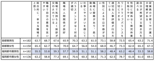 福岡都市圏の男性は、総合的な「職場の幸福度」が低く、さらに職場環境に関する多くの項目で、首都圏の男女や福岡都市圏の女性よりも低いスコアとなっています。福岡都市圏の男性にとって、職場環境が主観的幸福度にネガティブな影響を与えている可能性が懸念されます。