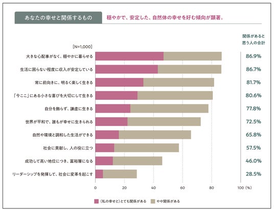 幸せの内容を把握するため、10項目を提示し、「あなたの幸せとどの程度関係があるか」を質問しました。「穏やかに暮らせること」や「収入の安定」が自分の幸福に関係があるものとして多くの人に挙げられる一方で、「成功や富」、「リーダーシップ」に関する項目は幸せとの結び付きが弱い結果となりました。また、「小さな喜び」「謙虚に」といった自然体の生き方や、「世界が平和」「自然や環境との調和」など社会との関係性も幸せの要素として意識されているようです。エリアや性別、年齢によって若干の数値の違いはありますが、傾向は一致しており、今日の日本人に共通した「幸福感」が垣間見えます。さらに、「幸せだと感じること」に関する自由回答では、「家族」「健康」「収入の安定」「自由」「仕事の充実」に関連した事柄が多く記入されていました。