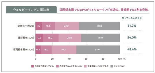 ウェルビーイングの認知(「内容まで理解している」「内容までなんとなくわかる」「言葉を聞いたことがある」の合計)は、回答者全体の5割を超え、51.2%となりました。首都圏では54.0%に達し、福岡都市圏の48.4%を上回りました。ただし、福岡市内では53.6%で、首都圏とほぼ同等の水準です。一方、ウェルビーイングを「内容まで理解している」人は全体の7.7%にとどまり、深い理解はまだ限定的です。