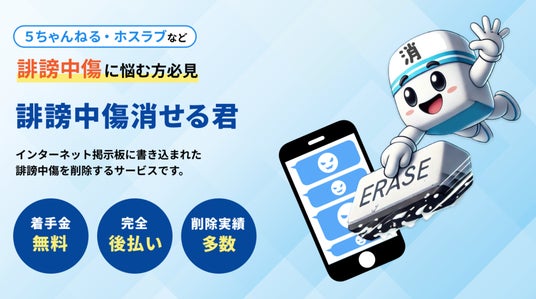 「誹謗中傷消せる君」は、オリエンタル法律事務所が運営する、インターネット掲示板での誹謗中傷の投稿を削除するサービスです。対応可能なインターネット掲示版は、5ちゃんねる・ホスラブ(ホストラブ)・爆サイ・雑談たぬきです。
