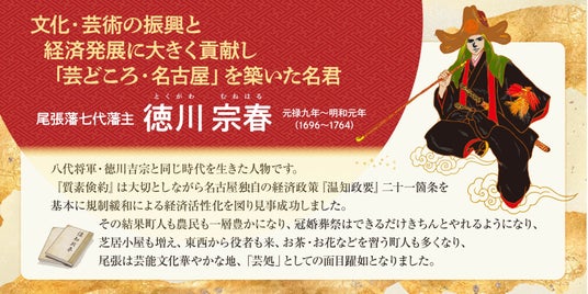 徳川宗春(1696-1764)は、時代劇「暴れん坊将軍」で知られる八代将軍・徳川吉宗と同時代に生きた尾張七代藩主です。宗春は『質素倹約』は大切としながらも、名古屋独自の経済政策『温知政要』二十一箇条を基本に規制緩和による経済活性化を図り見事成功しました。その結果町人も農民も一層豊かになり、冠婚葬祭はできるだけきちんとやれるようになり、芝居小屋も増え、東西から役者も来、お茶・お花などを習う町人も多くなり、尾張は芸能文化華やかな地、「芸処」としての面目躍如となりました。本イベントでは、宗春の影響を受けた名古屋の文化や彼の功績について、多くの方に知っていただく機会を提供いたします。