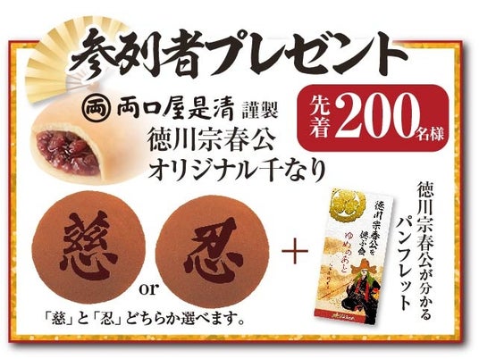 ご参加いただいた皆様には、老舗菓子店両口屋是清が製作した「宗春公オリジナル千なり」をプレゼントいたします。この特製の千なりは、宗春公を象徴する「慈」「忍」の2文字を焼き印した特別なものです。また、宗春公の功績を分かりやすく解説した三つ折りパンフレットもお配りいたします。