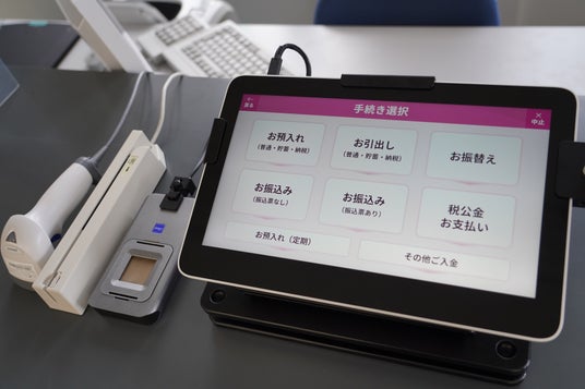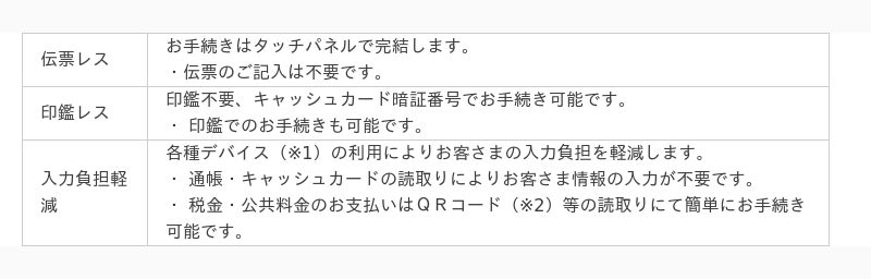 行員が操作方法をご案内しながら、お客さま自身でタッチパネルを操作することにより、伝票記入や印鑑押印等の負担軽減や手続きに係る待ち時間の短縮を実現します。