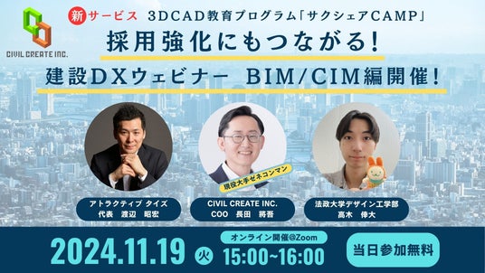 CIVIL CREATE株式会社の新サービス、土木業界向け3DCAD教育プログラム「サクシェアCAMP」を活用した、人材育成と採用成功の秘訣をオンラインウェビナーでお届けいたします。