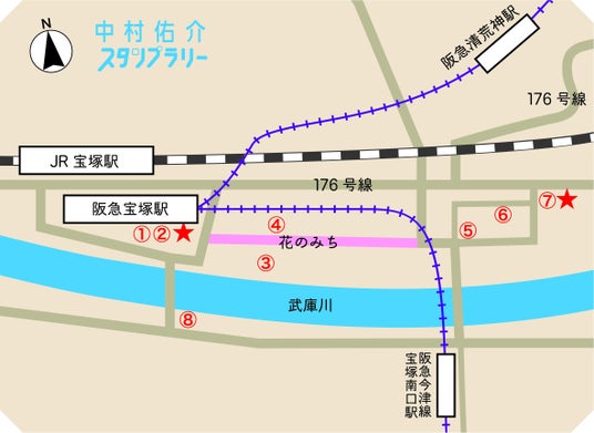 「中村佑介(なかむらゆうすけ)」氏は宝塚市出身のイラストレーター。2022年に活動20周年を迎え益々活躍中です。2020年に宝塚観光ガイドブックの表紙を、2024年に対となる新たなイラストを描き下ろすなど、宝塚市にゆかりの深いアーティストです。2つのイラストは、宝塚市制70周年記念企画として『宝塚ウェルカムフラッグ』として花のみちを彩っています。今回、宝塚市制70周年記念事業の一環として、花のみち周辺エリアでスタンプラリーイベントを実施します。ぜひ、宝塚へお越しください!