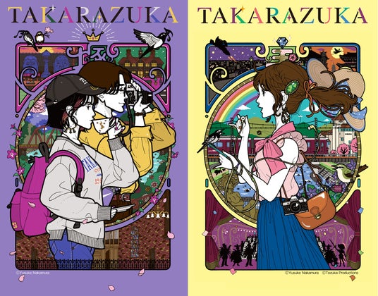 左)2024年の「宝塚市制70周年」に新たに描き下ろされたイラスト 右)2020年『宝塚観光ガイドブック』表紙の描き下ろしイラスト