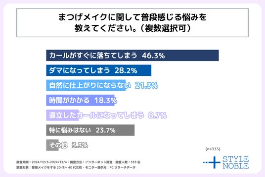 また「まつげメイクに関して普段感じる悩み」を尋ねる設問への回答では、1位が「カールがすぐに落ちてしまう」で46.3%、2位が「ダマになってしまう」で28.2%という結果となりました。ここではまつげメイクで重要視するポイントで上位にきた回答を阻害するようなものが悩みの上位にくる結果となりました。