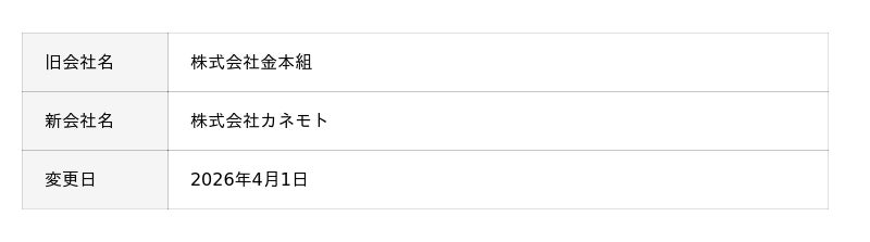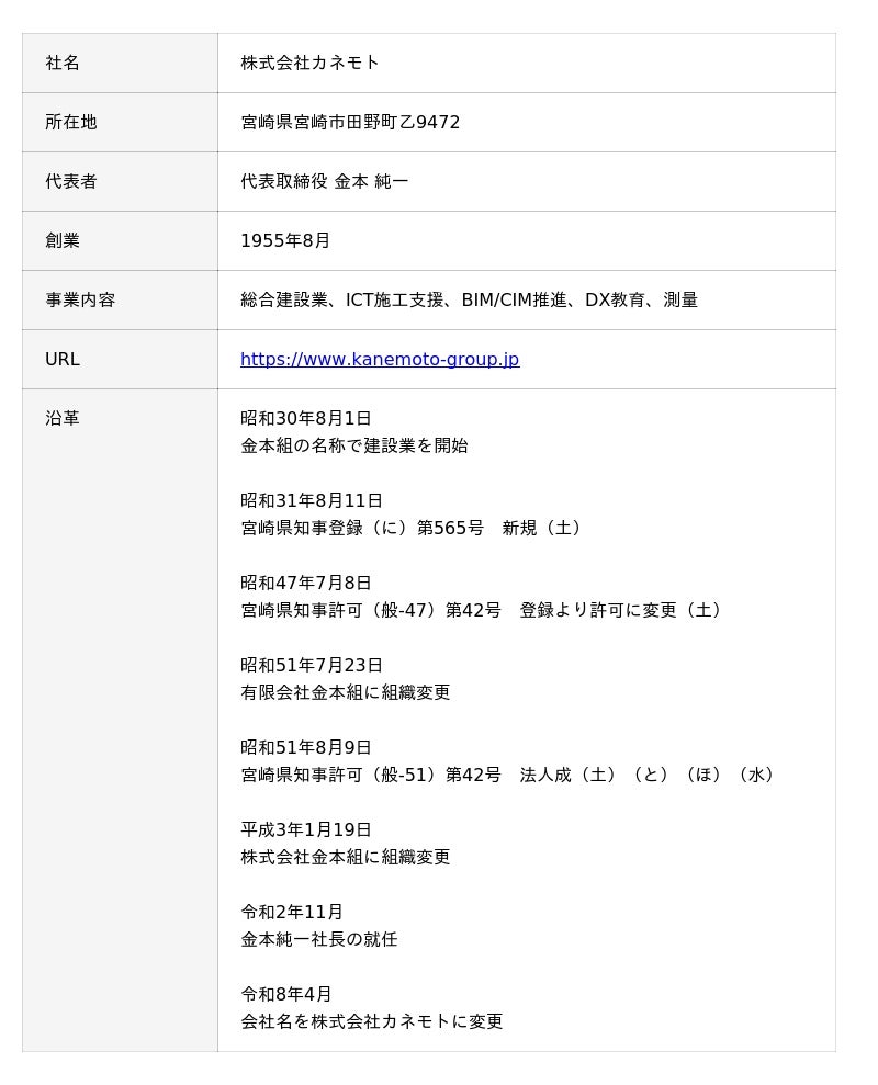 宮崎県を拠点に70年にわたり地域のインフラ整備を支えてきた株式会社金本組(本社:宮崎県宮崎市田野町、代表取締役:金本純一)は、2026年4月1日付で社名を「株式会社カネモト」(英文名:Kanemoto Inc.)に変更するとともに、ミッション・ビジョン・バリュー(MVV)を全面的に刷新いたしました。