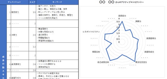 またスコア化されたそれぞれの特性を“キーワード化”し、シンプルな行動指標に落とし込み、誰でも手軽に行動特性分析・比較を具体的にイメージすることができ、社内での行動評価や営業会議でのアクションレビュー、採用活動など幅広いシーンでもご活用頂けることを目指しております。