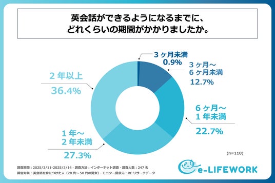 近年、グローバル化が加速する中で、英会話スキルの必要性が一層高まっています。特に、4月の新年度を迎えるにあたり、新たな環境でのスタートを控え、「何か新しいことを始めたい」と考える人も多いのではないでしょうか。その中でも、キャリアアップや自己成長の一環として、英会話の習得に取り組む人は少なくありません。しかし、英会話の習得方法にはさまざまな選択肢があり、独学で学べるものなのか、また、英会話スクールは効果があるのか、といった疑問を抱く方もいるものと考えられます。では、実際に英会話を習得した人々はどのような学習法で、どのくらいの時間を費やして英会話を習得したのでしょうか。そこで、株式会社e-LIFEWORKは、英会話を習得した方を対象に「学習方法とその効果」に関する実態を明らかにするための調査を実施しました。