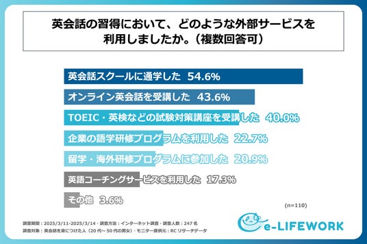次に、英会話を外部サービス(英会話教室など)を活用して習得したと回答された方に、「英会話の習得において、どのような外部サービスを利用したか」を尋ねる設問の回答では、1位が「英会話スクールに通学した」で54.6%、2位が「オンライン会話を受講した」で43.6%、3位が「TOEIC・英検などの試験対策講座を受講した」で40.0%という結果になりました。この結果から、外部サービスでは英会話スクールに通学した人が比較的多いことがわかりました。