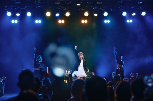 後半パートに入ると、黒のラグランTシャツにピンクのデニムを合わせたカジュアルスタイルにチェンジ。「朝もお昼も夢の中も」を爽やかに歌い上げ、ボーイッシュな一面をのぞかせる。「交換日記」では盛大なクラップが巻き起こり、「YU-RA YURA」では“ゆらゆら”の大合唱。前半以上に客席を巻きこみ、一体感ある公演を作り上げていく。