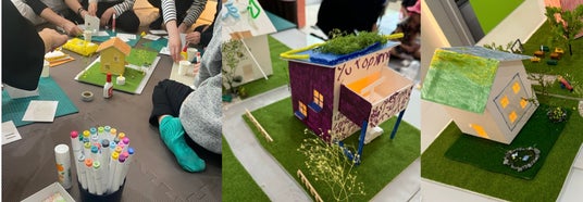 複数パターンある壁や屋根からお好みのものをお選びいただき、組み立て、色を塗って、オリジナルの住宅模型づくりを体験いただけます。最後は、完成したみんなのお家と道路等を組み合わせて、ひとつの住宅街を再現。ご自身でおつくりいただいたお家(1棟)はお持ち帰りいただけます。