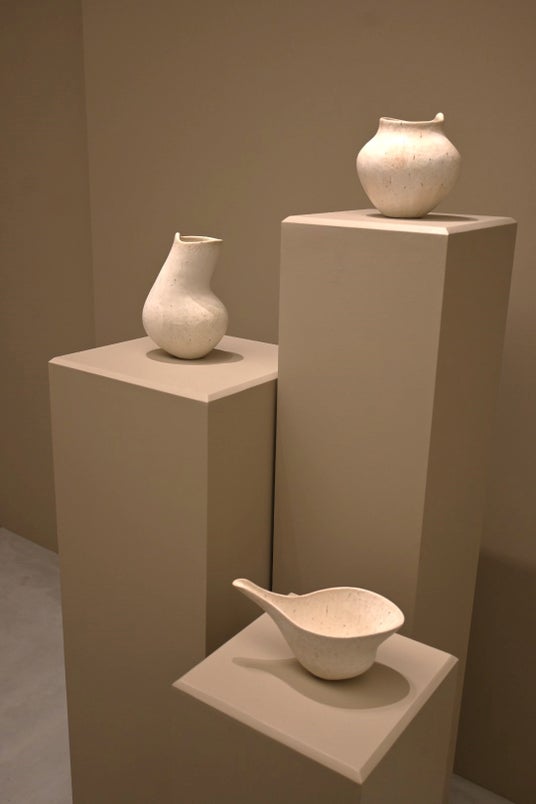 ・ 店内デザイン : 店内は白からグレーが混ざり合うミニマルな設計で、作品自体の個性が際立つ空間を演出しています。まるで美術館の一角にいるかのような落ち着いた雰囲気です。