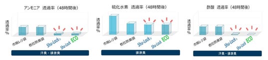 ■防臭性能評価 卵の腐ったニオイ(硫化水素)、尿臭・疲労臭(アンモニア)、汗臭、皮脂臭、加齢臭(酢酸臭)などの「ニオイ」の元となる成分濃度を2日間(48時間)測定し、透過率を比較しました。実験結果は以下のグラフの通りです。