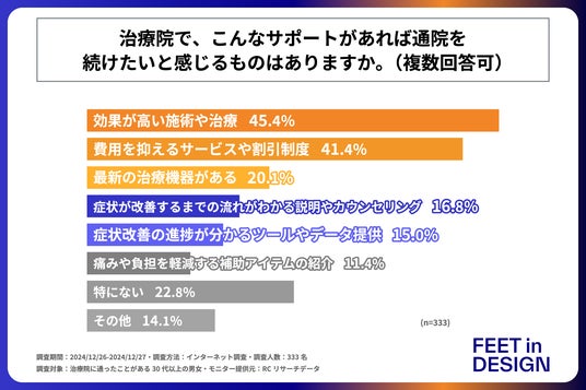 調査の最後、「治療院で、こんなサポートがあれば通院を続けたいと感じるものはあるか」を問う設問の回答では、1位が「効果が高い施術や治療」で45.4%、2位が「費用を抑えるサービスや割引制度」で41.4%という結果になりました。この結果から治療院には効果が高い施術や治療や、施術や治療を安価に提供してくれるサービスを求めている人が多いことがわかりました。