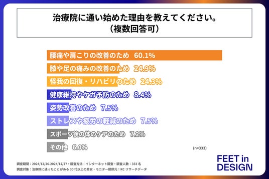 まず、「治療院に通い始めた理由」を尋ねる設問への回答では、1位が「腰痛や肩こりの改善のため」で60.1%、2位が「膝や足の痛みの改善のため」で24.9%、3位が「怪我の回復・リハビリのため」で24.3%という結果になりました。この結果から、何らかの痛みの改善を目的として、治療院に通い始めた人が多いことがわかりました。