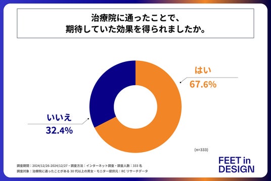 続いて「治療院に通ったことで、期待していた効果を得られたか」を問う設問への回答では、「はい」が67.6%、「いいえ」が32.4%という結果になりました。この結果から、過半数の人は治療院に通ったことで、期待した効果を得られたと感じていることが判明しました。
