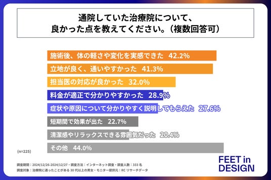 また、治療院に通ったことで、期待した効果を得られたと回答された方に「通院していた治療院について、良かった点」を尋ねる設問の回答で多かったのは、1位が「施術後、体の軽さや変化を実感できた」で42.2%、2位が「立地が良く、通いやすかった」で41.3%、3位が「担当医の対応が良かった」で32.0%という結果になりました。この結果から、治療院に満足度に関わる主なポイントは、施術の効果、治療院の立地の良さ、施術者の対応の良さであることがわかりました。