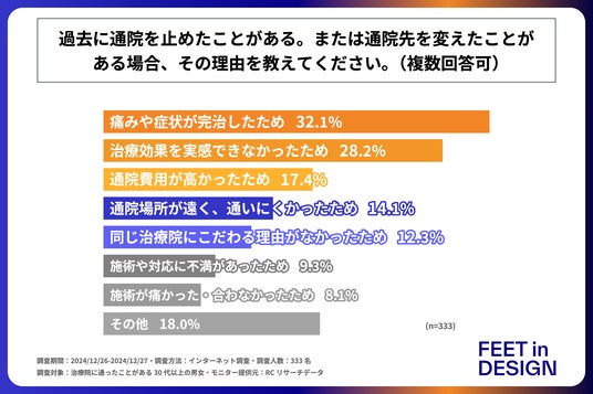 次に「過去に通院を止めたことがある。または通院先を変えたことがある場合、その理由」を尋ねる設問の回答では、1位が「痛みや症状が完治したため」が32.1%、2位が「治療効果を実感できなくなったため」で28.2%、3位が「通院費用が高かったため」で17.4%という結果になりました。この結果から、「症状の完治」という積極的な理由を除き、過去に通院を止めたり、通院先を変えたことがある人が、そうした行動を起こした主な理由は「治療効果の実感のなさ」や「費用の高さ」であることが明らかになりました。