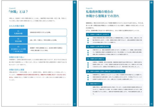 また、豊富なケーススタディを通じ、実務担当者が抱えがちな悩みに対する具体的な解決策を提示しています。休職者への面談フローの標準化や復職支援プログラムの設計など、どのように進めればよいのかが明確になるため、人事・労務担当者はもちろん経営層の方にも活用いただける内容です。