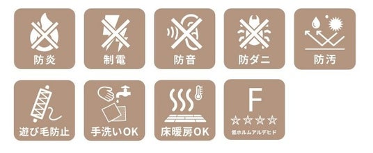 サイズは他のシリーズ同様50cm×50cm。防炎、静電、防音、防ダニ、遊び毛防止、ホルムアルデヒド排出基準で最も安全性の高いF☆☆☆☆、手洗い可能、床暖房対応、カッターで簡単カット可能という機能性はそのままに、新しく防汚加工も追加しました。汚れにくく、汚れても落ちやすいため、ペットや小さいお子さまのいるご家庭でも安心してお使いいただけます。
