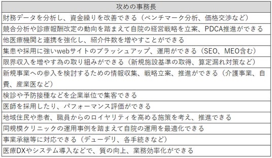 「攻めの事務長」では、事務長の基本である「守りの事務長」の業務に加えて、経営改善や事業拡大を主体的に推進できるレベルがゴール設定です。