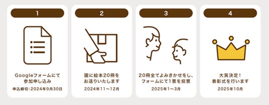 園児さんと先生が一緒に選定するということがこの大賞の一番の特徴です。ご応募いただいた全国の幼稚園・保育園などの保育施設へ絵本20冊をお送りし、実際に「よみきかせ」を行い、その中から1冊を投票いただきます。投票数が最も多かった絵本を大賞として表彰いたします。2025年10月に表彰式が行われる予定です。
