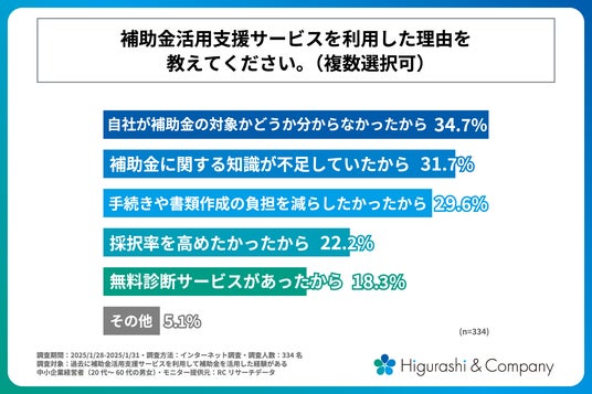 続いて、「補助金活用支援サービスを利用した理由」を尋ねる設問への回答では、1位が「自社が補助金の対象かどうか分からなかったから」で34.7%、2位が「補助金に関する知識が不足していたから」で31.7%、3位が「手続きや書類作成の負担を減らしたかったから」で29.6%という結果になりました。この結果から、補助金活用支援サービスを利用した理由として大きいものは「知識不足」であることが判明しました。