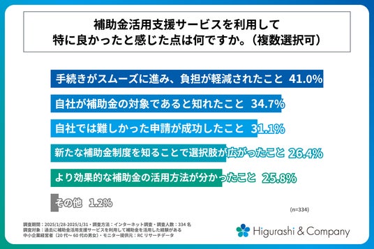 補助金活用支援サービスを利用して特に良かったと感じた点の1位は「手続きがスムーズに進み、負担が軽減されたこと」