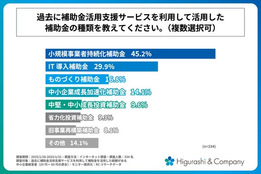 株式会社Higurashi&Company(本社:東京都杉並区、代表取締役:日暮 健一)が運営する「補助金申請支援センター」は、過去に補助金活用支援サービスを利用して補助金を活用した経験がある中小企業経営者を対象に「補助金活用支援サービスの利用実態」に関する調査を実施しました。この調査結果から、中小企業経営者の補助金活用支援サービスの利用実態などが明らかになりました。