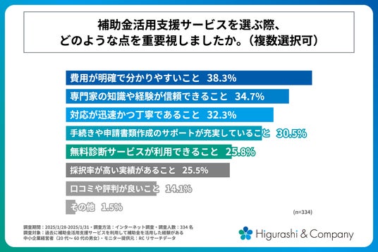 次に、「補助金活用支援サービスを選ぶ際、どのような点を重要視したか」を問う設問の回答では、1位が「費用が明確で分かりやすいこと」で38.3%、2位が「専門家の知識や経験が信頼できること」で34.7%、3位が「対応が迅速かつ丁寧であること」で32.3%という結果になりました。ただ、4位以降も回答率20%以上の回答が複数並ぶ形となり、補助金活用支援サービスを選ぶ際に重要視するポイントは多岐に渡ることが、この結果から明らかになりました。