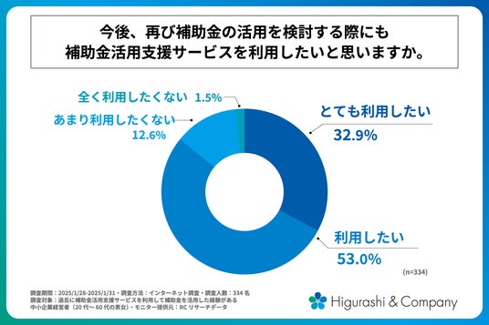 調査の最後、「今後、再び補助金の活用を検討する際にも補助金活用支援サービスを利用したいと思うか」を尋ねる設問への回答で多かったのは、1位が「利用したい」で53.0%、2位が「とても利用したい」で32.9%という結果になりました。この結果から、過去に補助金活用支援サービスを利用して補助金を活用した中小企業経営者の8割以上が、再び補助金の活用を検討する際にも補助金活用支援サービスを利用したいと思っていることが明らかになりました。