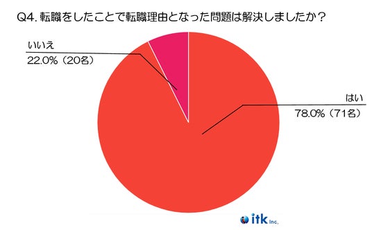 この結果から、多くの人が転職をすることで、抱えていた問題を解消できたと感じていることがうかがえます。ただし、22%の人は転職後も問題が解決されていないと感じており、転職が必ずしもすべての課題を解消するわけではないことが示されています。