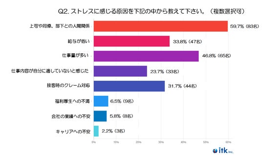 https://i-t-k.co.jp/ 業界最大級の飲食店求人を誇るitkが実施!現在飲食業界で働いている方、又は過去働いた経験がある方150名対象に「飲食業界で働く人々が感じるストレス要因」を調査